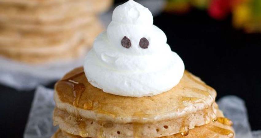 • Whip the cream until thick, adding the powdered sugar slowly until you have stiff peaks. Place the cream in a pastry bag and pipe ghost shapes onto the top of each stack of pancakes. Use mini chocolate chips for the eyes. Serve with plenty of maple syrup.